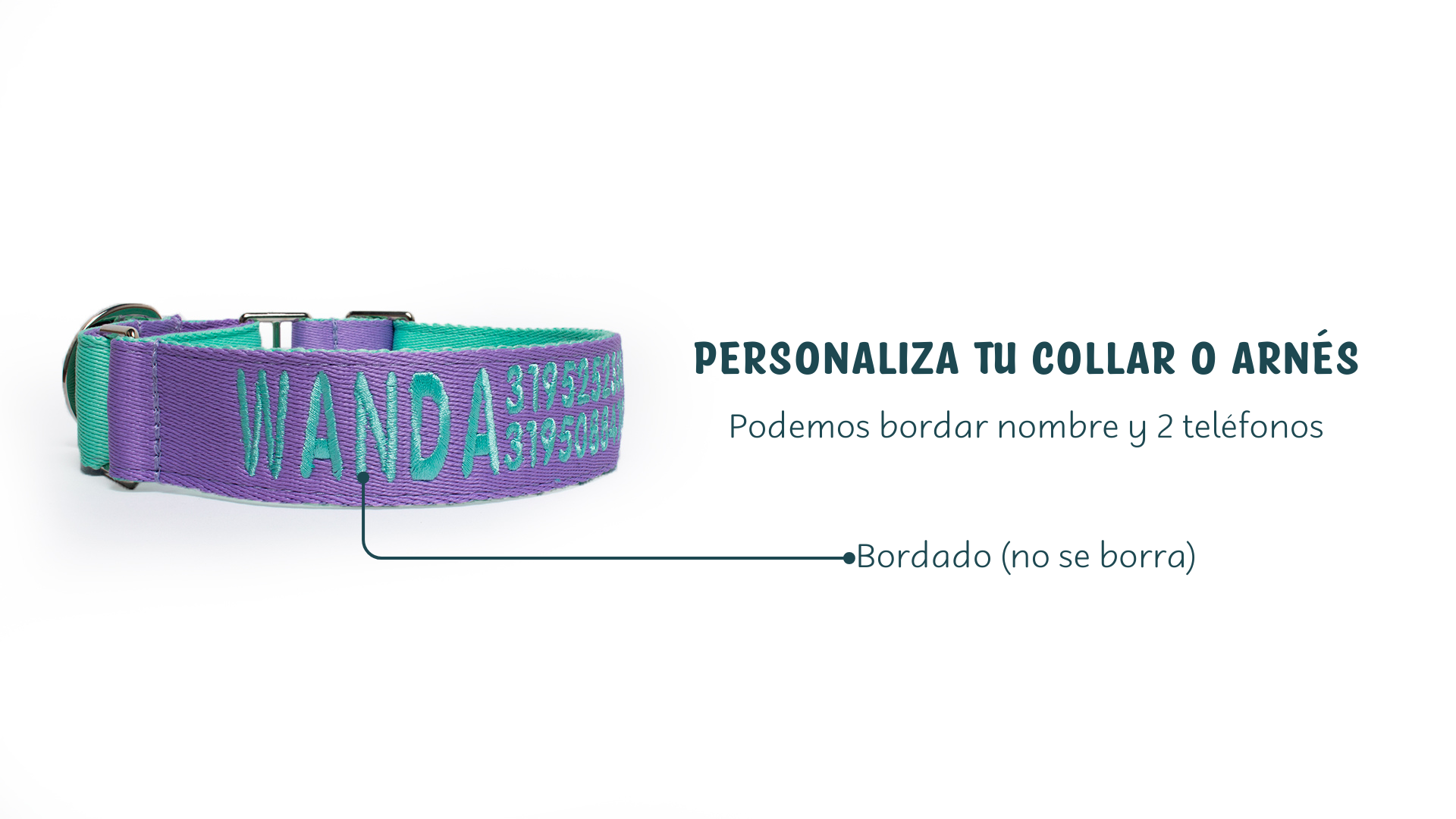 Bordamos el collar o arnés de tu perro o gato. No se borra y es muy legible